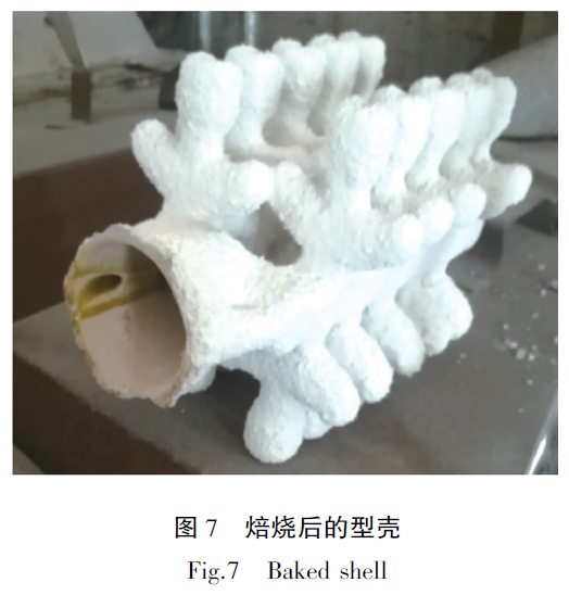樹脂模在焙燒過程中容易發(fā)生膨脹脹裂型殼,本工藝樹脂模因其表面涂有蠟,預(yù)熱溫度60℃時蠟已經(jīng)開始融化,使模型與殼之間產(chǎn)生了間隙,徹底解決了因樹脂焙燒膨脹而對模殼產(chǎn)生的脹裂問題。樹脂模必須采用天然氣爐焙燒,樹脂在天然氣爐中瞬間燃燒消失減少了其因膨脹而對型殼損壞。圖6 為天然氣焙燒爐,圖7 為焙燒后的型殼。制好的的型殼組盤后即可澆注,澆注好的鑄件如果是重量輕、壁厚薄的鑄件其表面污染層薄,無需專門去除,經(jīng)過熱等靜壓、精整和包裝后即可發(fā)給客戶。